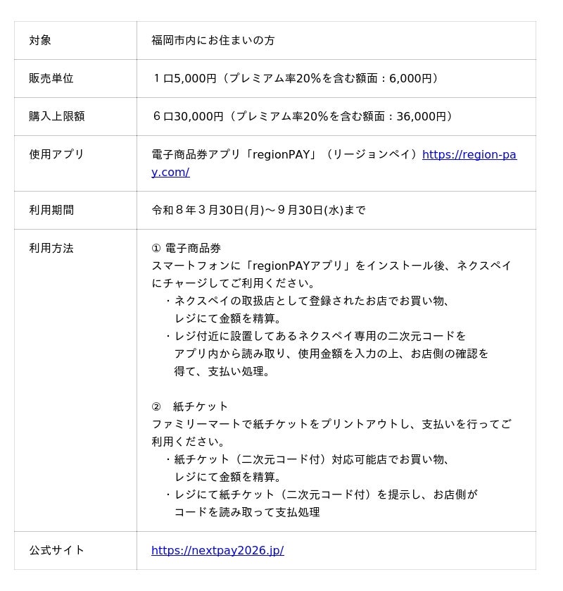 福岡商工会議所・志賀商工会・早良商工会は、福岡市内における消費喚起及び中小企業の事業発展を後押しするため、プレミアム付電子商品券「FUKUOKA NEXT Pay(ネクスペイ)」を発行します。