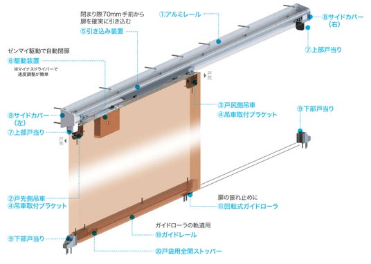 「スライデックス ソフトクローザー(R)」シリーズは、扉を吊り下げる〈引戸クローザー装置〉で、設置により開けた引き戸を最後まで自動で確実に閉めてくれる装置です。制御装置によって扉がゆっくり閉まるため、指はさみ事故なども防ぎやすくなります。病院や店舗、老健施設、公共施設など不特定多数の利用が想定される施設の扉に最適です。なお、スライデックスは全て室内扉向けの製品です。