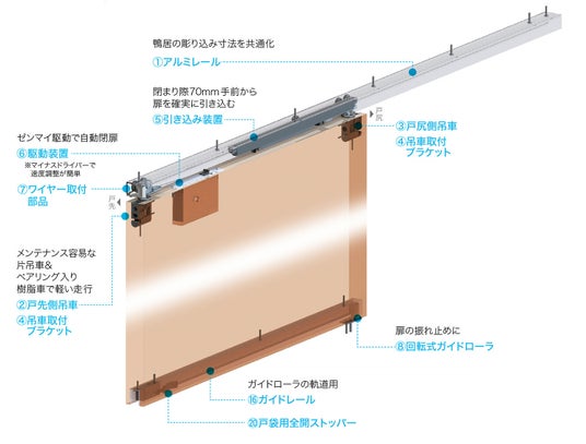 今回の新製品は、アウトセット仕様のレール壁付けタイプ「HCS-OJSC352」と、レール天付けタイプの「HCS-JSC35TS2」の2種類。いずれもアルミレール、吊車、駆動装置などの必要部品がセットになっています。(扉は別途必要です。)対応扉は木製のみ、扉質量は1枚あたり10~35kgに対応します。