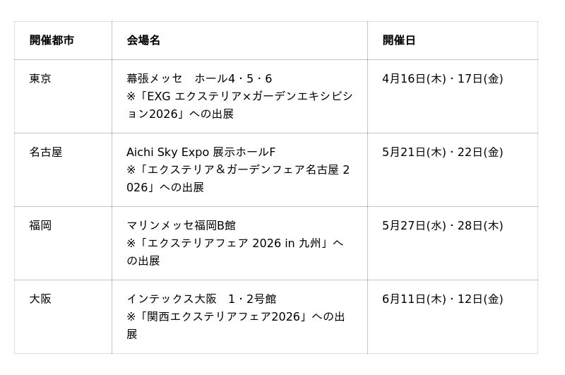 「エクステリアフェア 2026」展示イメージ(東京・名古屋・大阪)