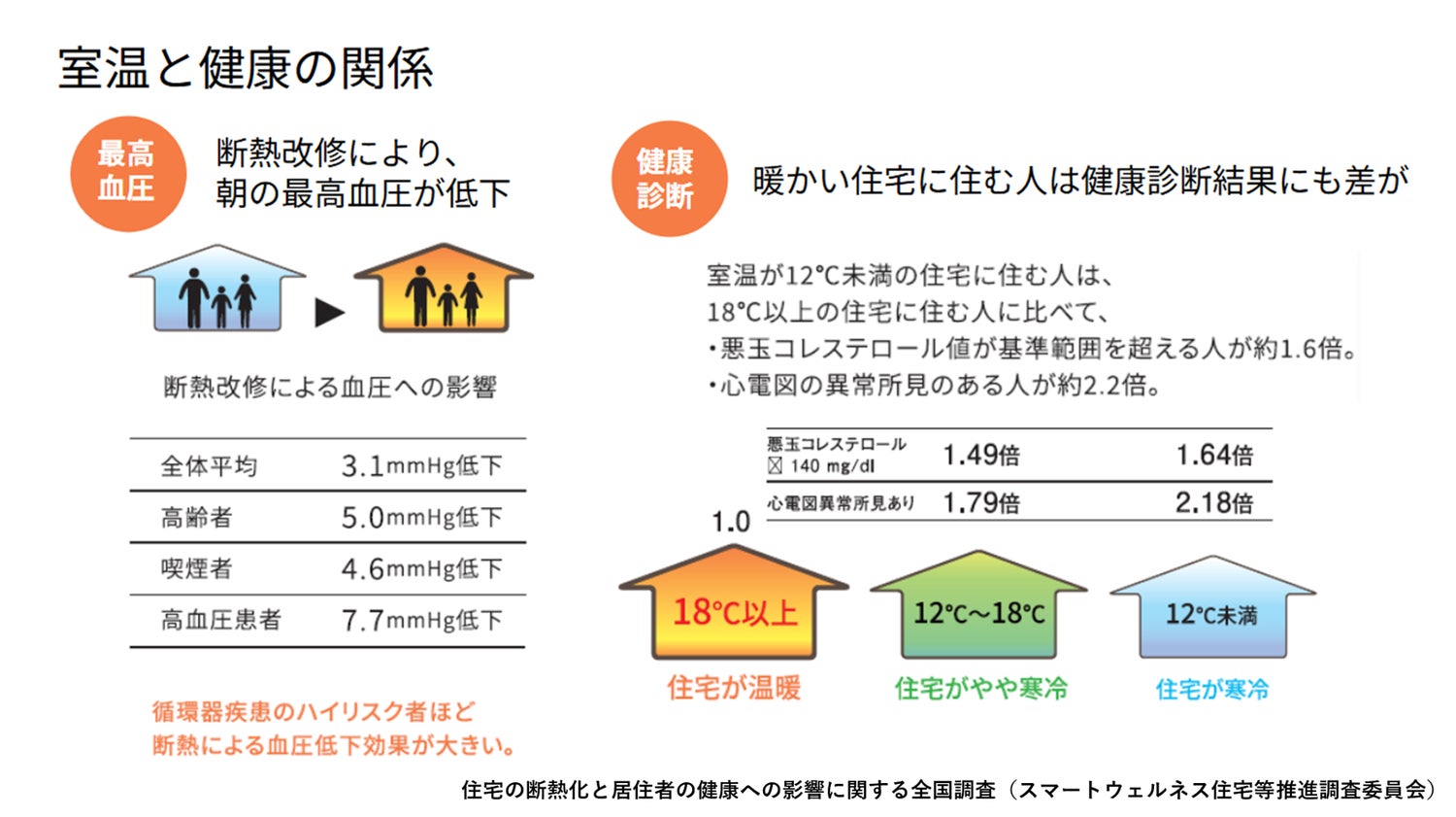 ▲断熱改修は血圧低下や健康診断結果など、健康に有意*に影響があるとスマートウェルネス住宅等推進調査委員会より報告