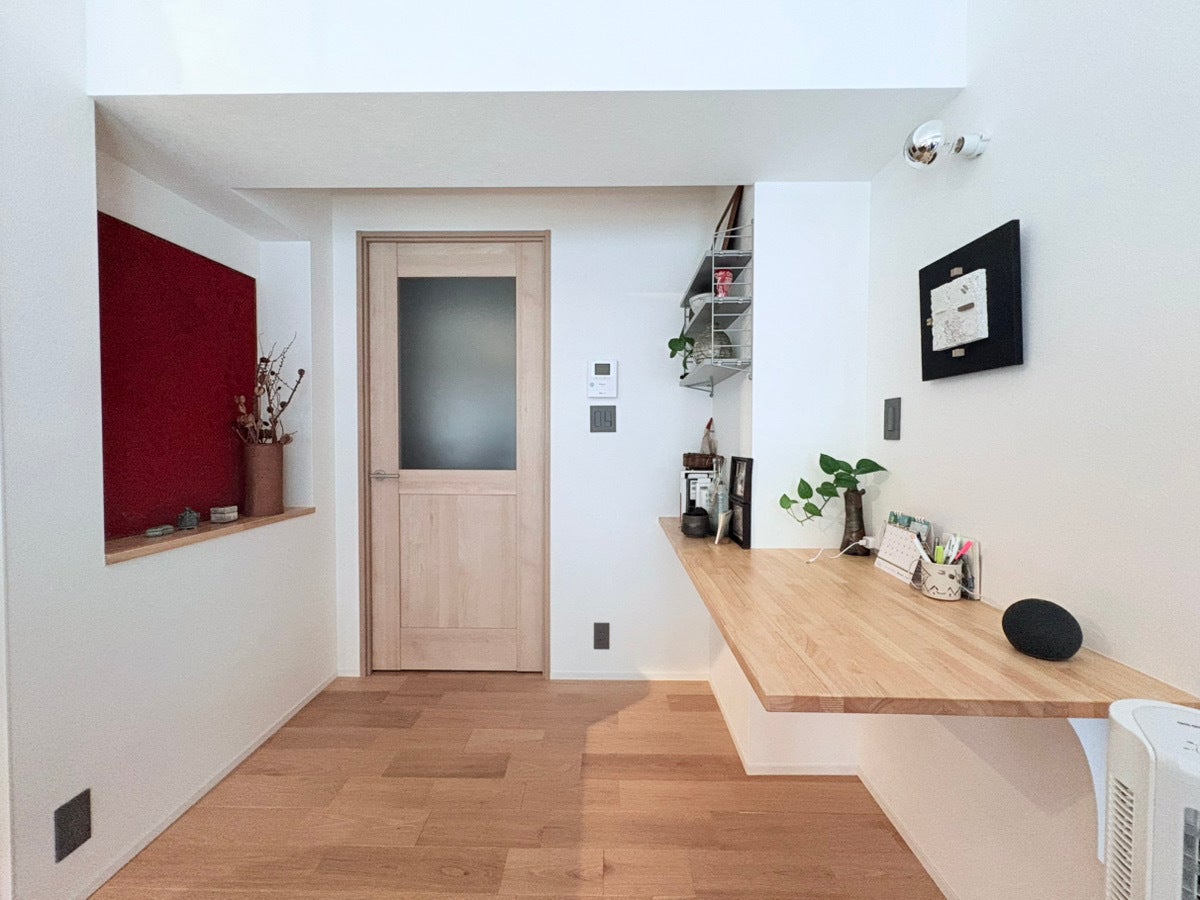 ▲リビングの入口にある備え付けの造作カウンター。キッチンの棚や作業カウンターなど、造作家具が備わっている