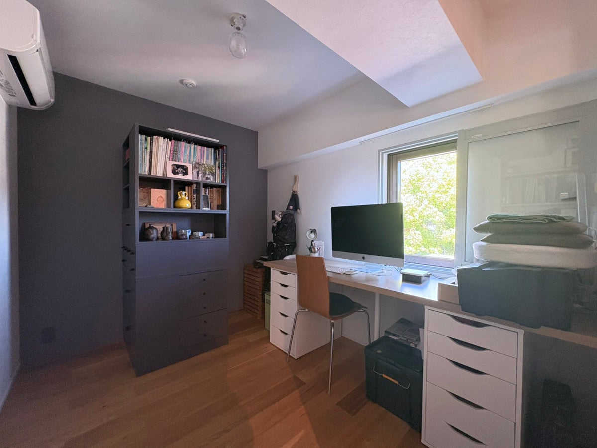 Uさん妻:ひとつは寝室、もうひとつは書斎にしました。本来は子ども部屋として想定されていたようですが、室内窓があって開放感があり、まさに書斎にぴったりだと思いました。窓際に合うサイズのテーブルをオーダーで作って置いています。窓も多くてとってもお気に入りの場所です。