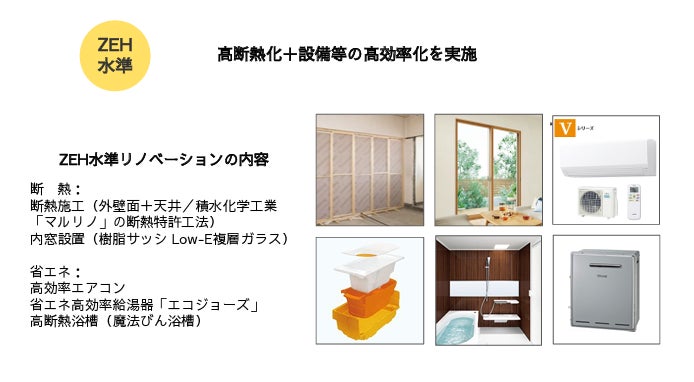 ZEHは、「net Zero Energy House(ネット・ゼロ・エネルギー・ハウス)」の略語。両社が提供する「ZEH水準リノベーション」とは、「正味のエネルギー収支ゼロ以下を目指す」ZEHの3つの要素(①住宅の高断熱化②住宅設備等の高効率化③創エネルギー)のうち、③創エネルギーを除いた①高断熱化と②高効率化の基準を満たす「ZEH Oriented」に適合した省エネ性能向上リノベーション。