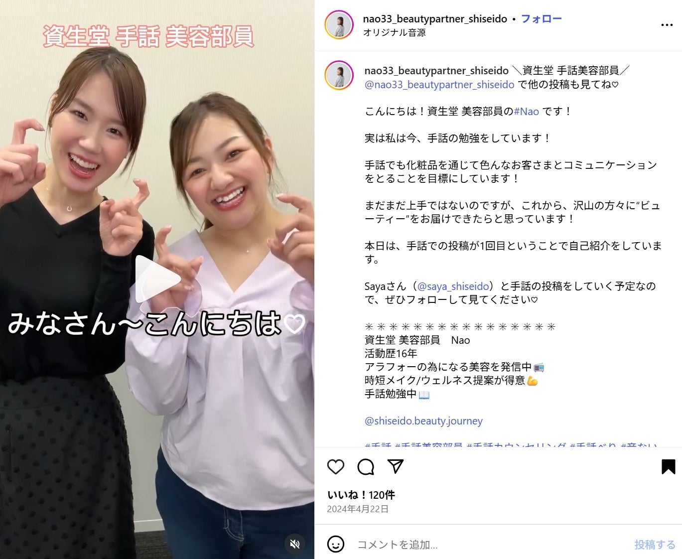 Nao 「楽しかった!」「商品買ってみます!」というお声をいただいています。私は手話が第一言語ではないため不安がある分、こういったお言葉をいただけるのはうれしいです。手話を通じたくさんの方とお会いして、美容のお悩みに応えたいです。困ったら資生堂がいる、ということを思い出していただきたい。そして、手話で美容相談することが当たり前になるくらい身近な存在になりたいです。