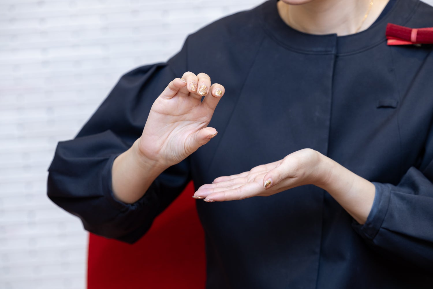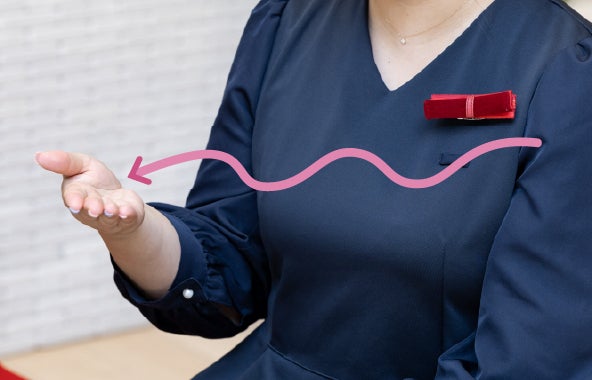 須崎 資生堂の接客をご体験いただくので、「美しい表現」にもこだわりました。美容の体験を心から楽しんでいただくために、腕の動かし方や指先、表情までが優雅であること、手話表現に資生堂のブランドアイデンティティを込めました。例えば「紹介」という単語。私たちはそこに「プレゼントをするような」という丁寧な気持ちを込め「紹介いたします」という手話表現を採用しました。優雅な手の動きに加え、柔らかな表情に口もとは通常よりも大きく開け、ゆっくり話し、口の動きがわかるようにしています。