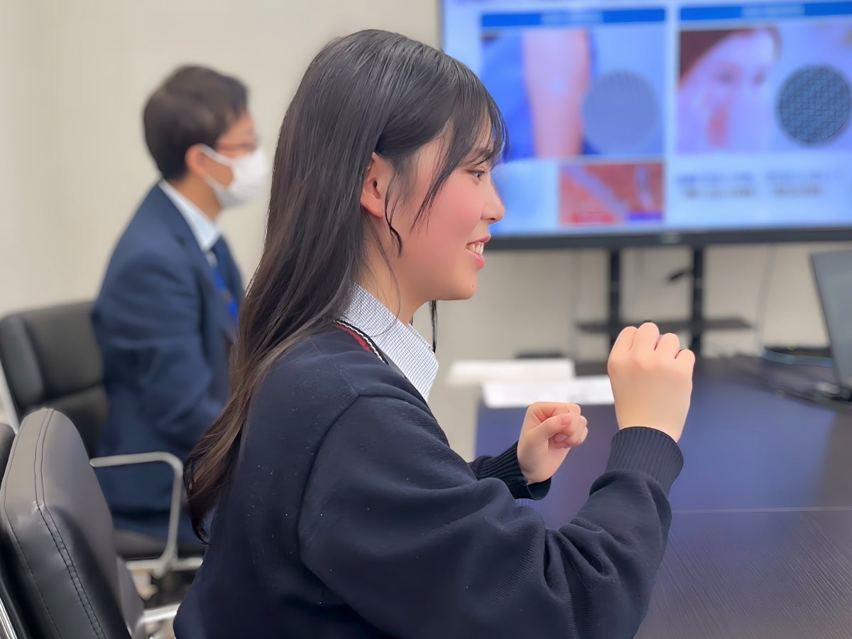 「興味を持ったきっかけは、妹が小さい頃、予防接種の注射でいつも泣いていたことなんです。痛みを少しでも減らす技術が、子どもから大人まで多くの人に治療の安心を与えるのではないかと考えました。コスメディ製薬の”注射で泣く子をゼロにしたい”という言葉に強く心を動かされて、ぜひマイクロニードルについて、技術的な側面からお話を伺いたいと思いました。」(いちかさん)
