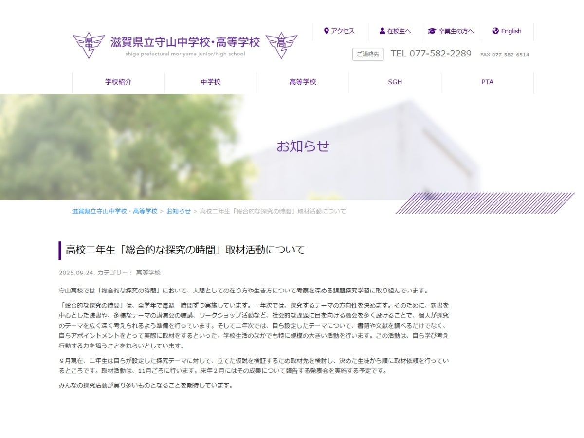 ※守山中学校・高等学校Webサイト「お知らせ」より