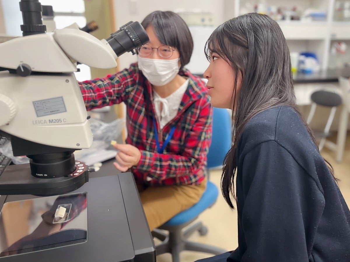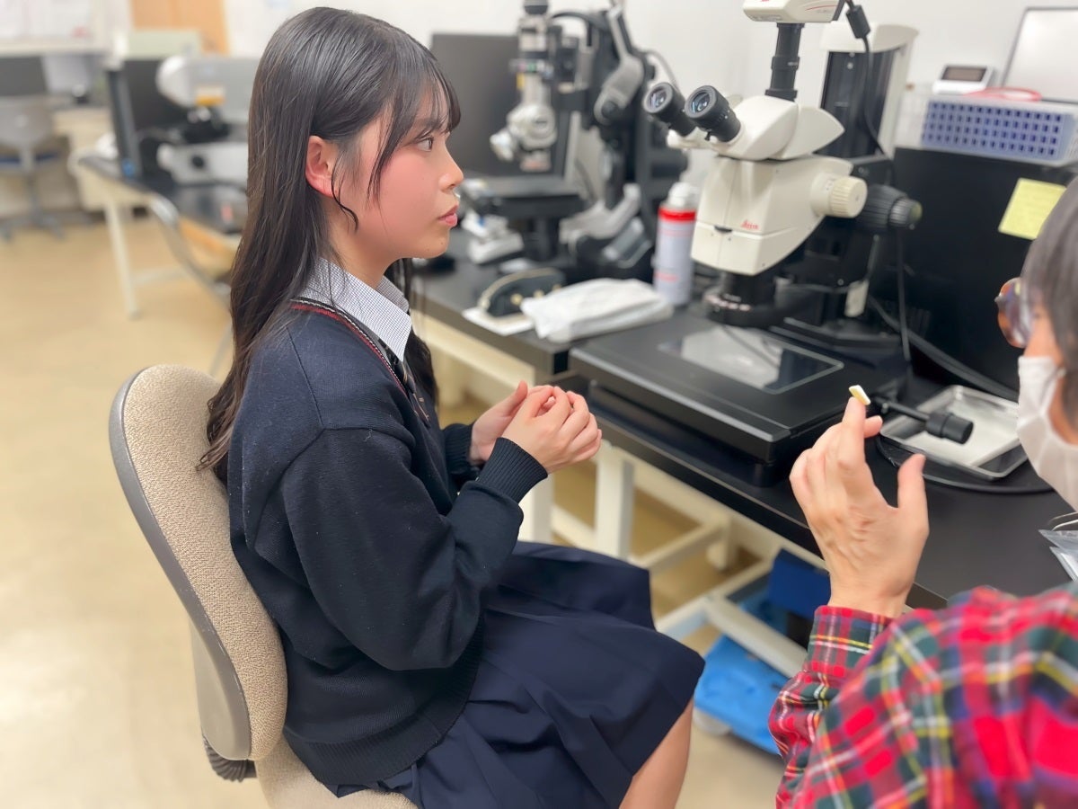 いちかさんはスタッフから、マイクロニードルによる薬剤投与の仕組みについて説明を受け、肉眼では見えないマイクロニードルを初めて大きな顕微鏡で覗きました。