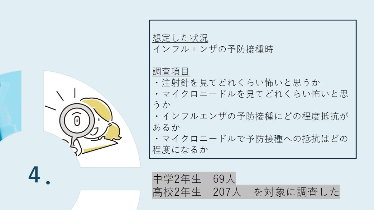 すでに国内でインフルエンザの流行が始まったこともニュースになっていましたので、中高生も「インフルエンザの予防接種」は想像しやすい身近なトピックです。検証調査は「インフルエンザワクチン接種に対する心理的な抵抗感」にフォーカスし、アンケート調査で「痛みの少ない注射」であるマイクロニードルの可能性を検証することにしました。