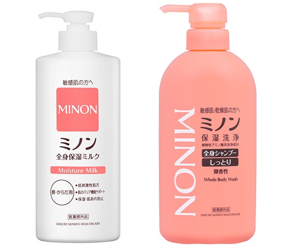 【写真左から、「ミノン全身保湿ミルク」(販売名:DSミルクz)、「ミノン全身シャンプー しっとりタイプ」 (販売名:ミノン全身シャンプー) いずれも医薬部外品】