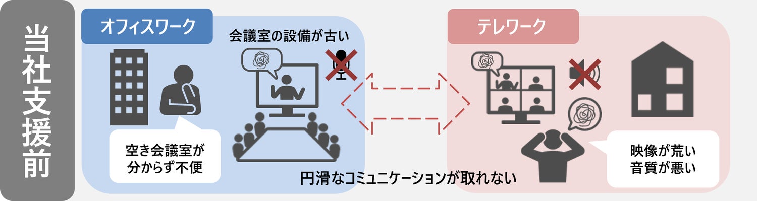 オンライン会議では、相手の表情や状況が見えにくいため、映像・音声の品質が会議の満足度に大きく影響します。しかし多くの企業では、会議設備の老朽化による音声の途切れやタイムラグといったオンライン会議特有の問題に悩まされています。さらに、会議室の利用状況をリアルタイムで把握しづらいなど、これらの課題は従業員のストレスや業務効率の低下を招くとともに、顧客対応や社内コミュニケーションの質にも悪影響を及ぼしています。
