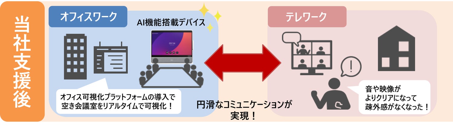 このように最適な会議環境が整うことで、オフィスにいる従業員とテレワークで働く従業員が物理的な距離を感じることなく、スムーズで円滑にコミュニケーションを取れるハイブリッドワーク環境が実現します。これにより、従業員の一体感が強化され、意思決定の迅速化や業務効率の向上が期待できます。
