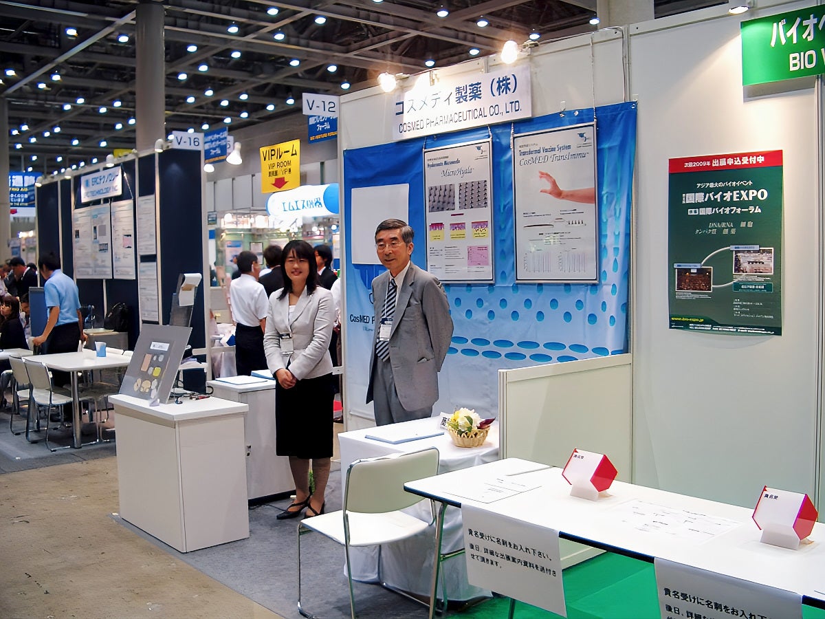 ※2008年開催「第7回 国際バイオEXPO」のコスメディ製薬のブースで。展示会も二人の研究者が運営(IM室提供)