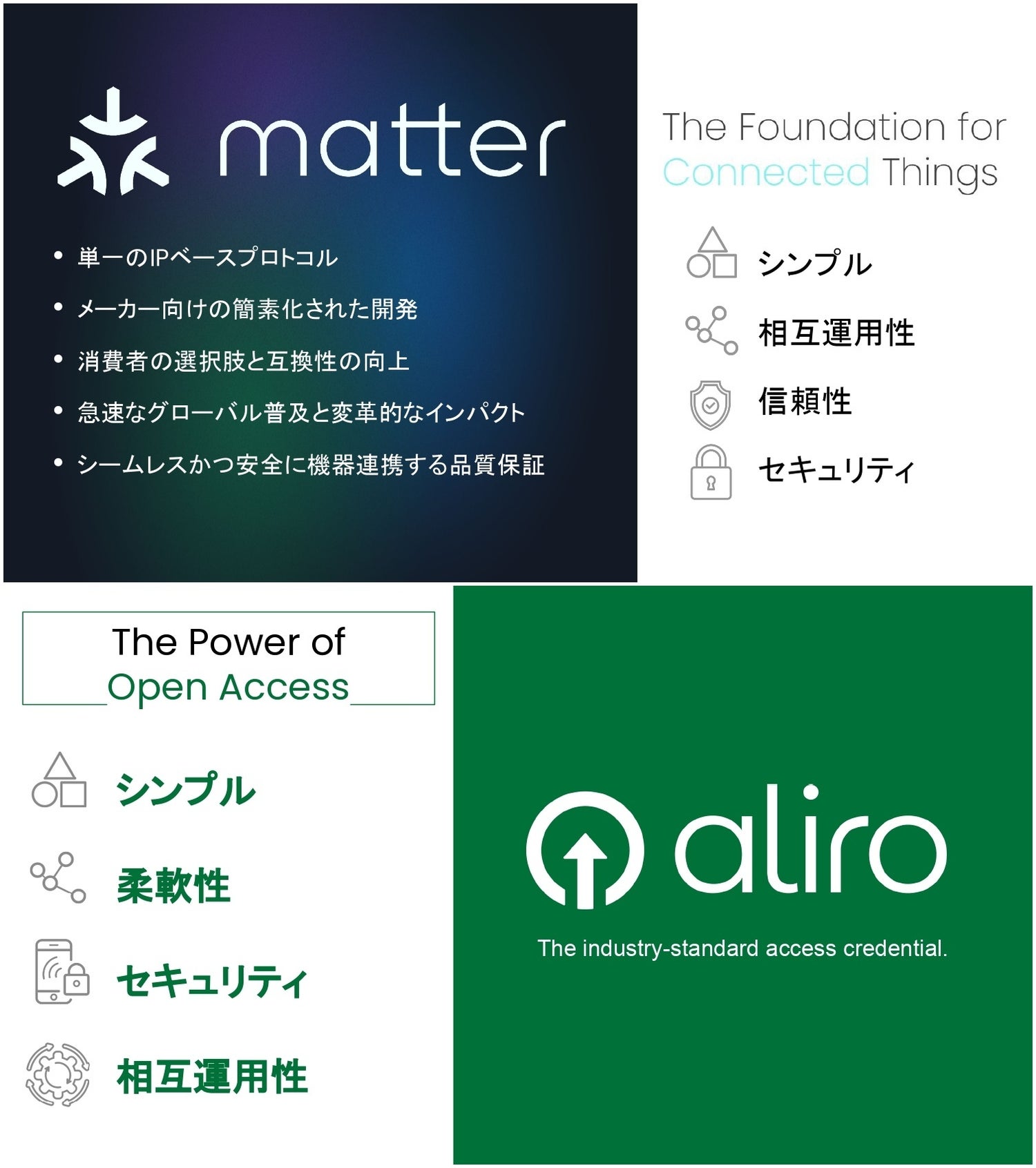 相互運用性によって、わかりやすく、簡単に繋がるだけでなく、MatterやAliroは、セキュリティも担保しています。消費者にとってもメーカーにとっても、これらの4本柱はメリットとなります。