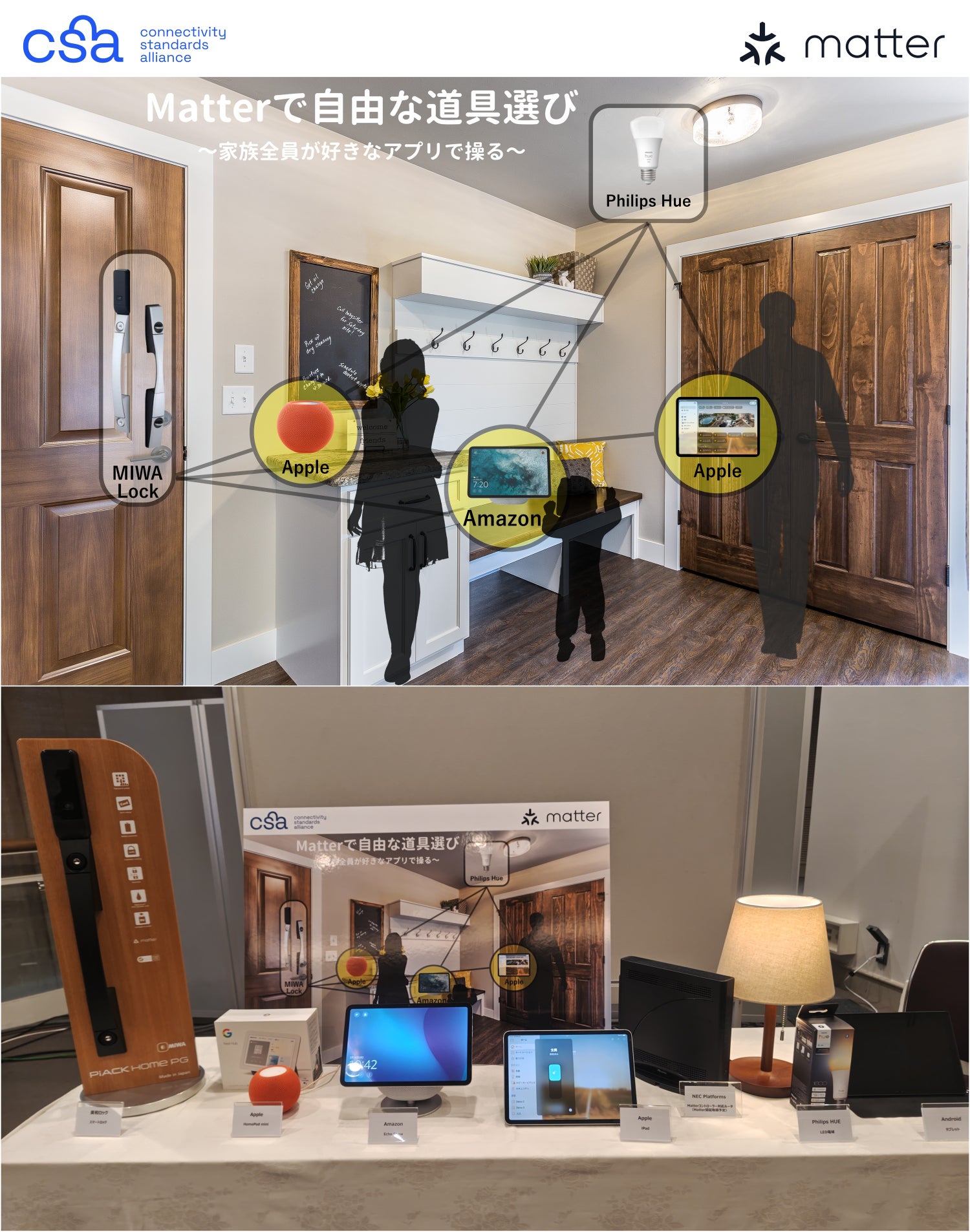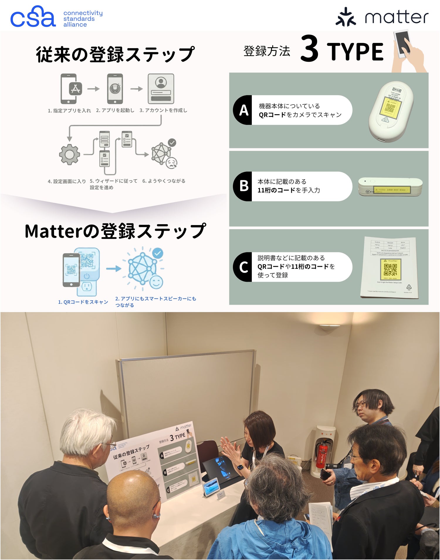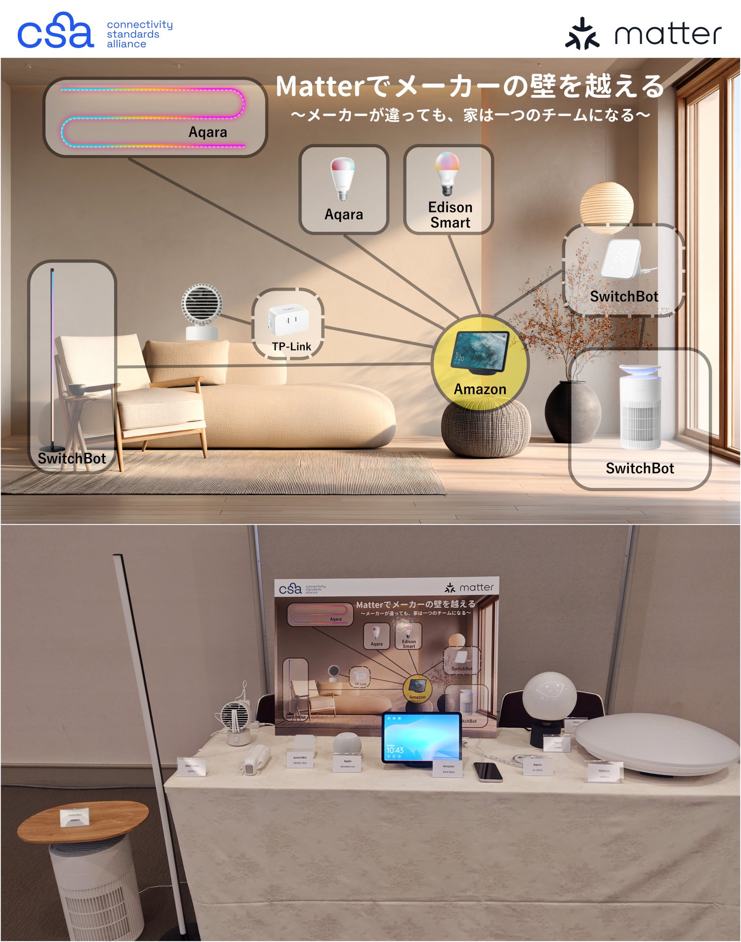 会場では、Matterが掲げる「シンプルさ」と「相互運用性(メーカーの垣根を超えた連携)」を体験できる3つのブースが用意されました。