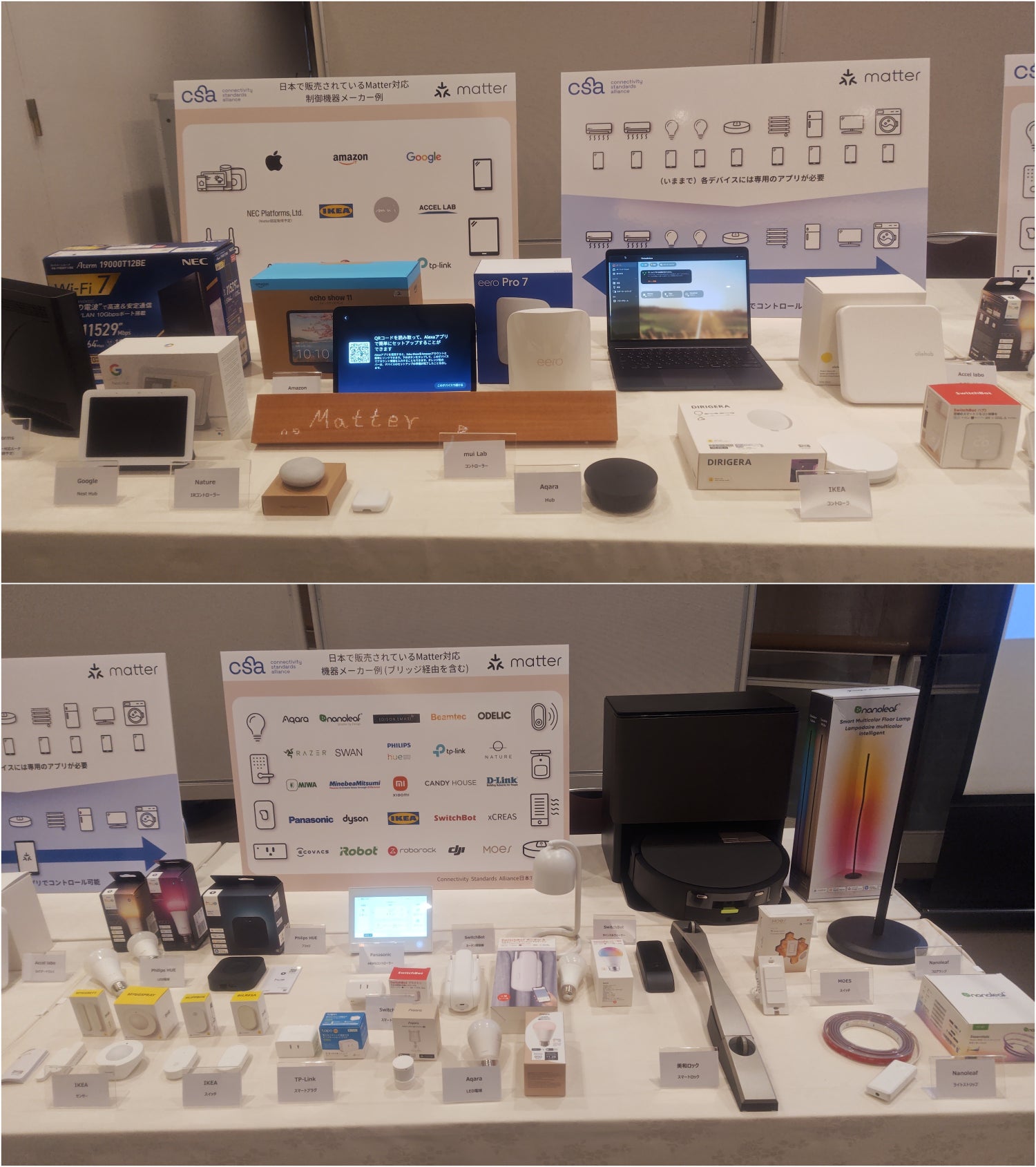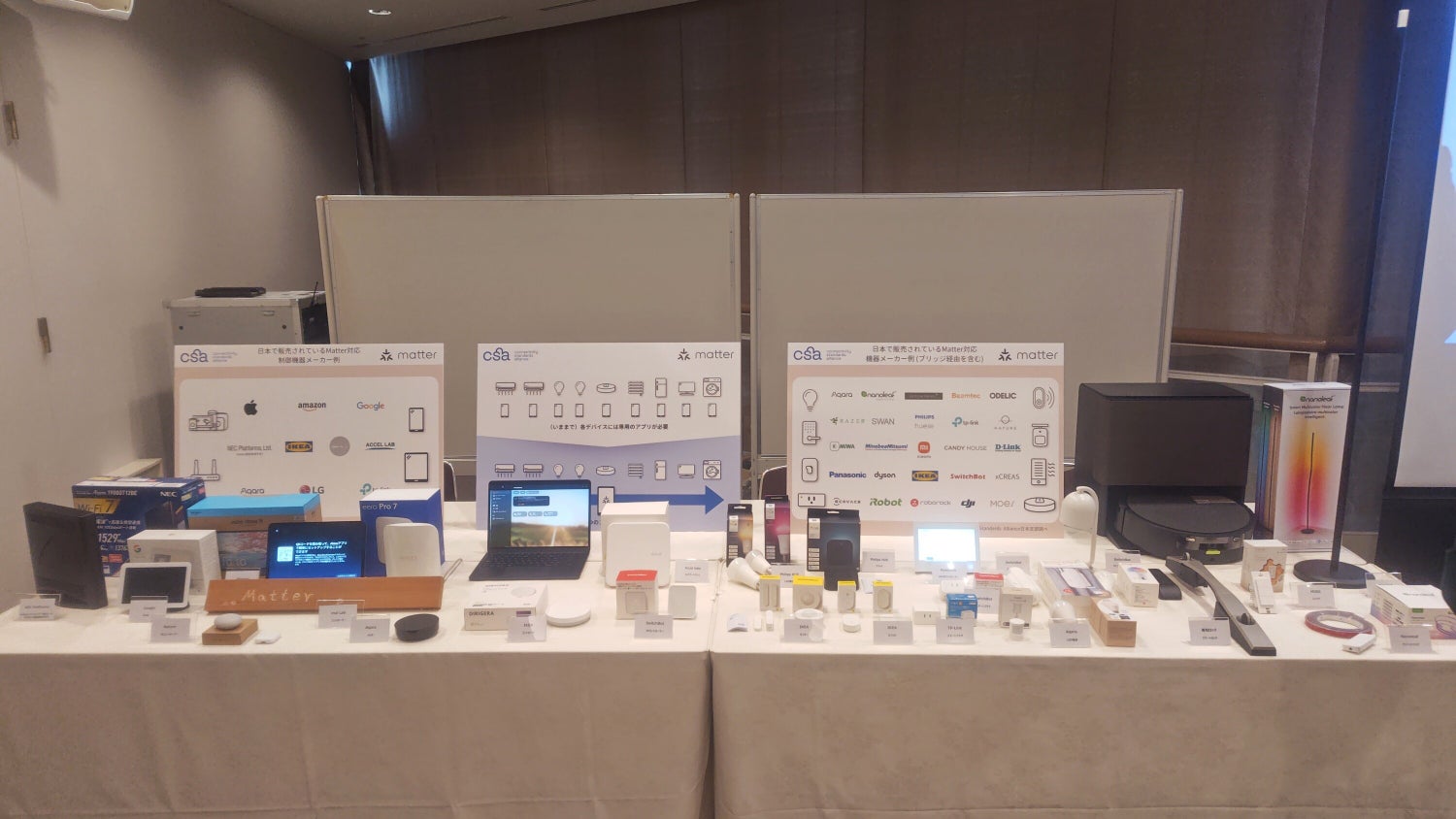 また、現在国内で流通しているMatter対応製品の一部の展示スペースも。国内メーカー、海外メーカー問わず様々なバリエーションの製品が並びました。(一部はB2Bのみの展開)
