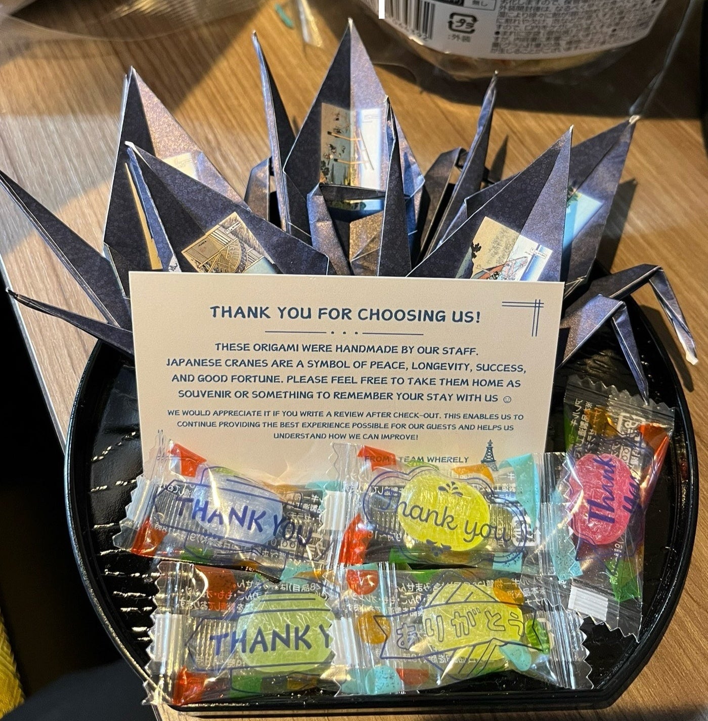 人の手が感じられる設計として、客室に折り鶴とウェルカムメッセージを添えています。