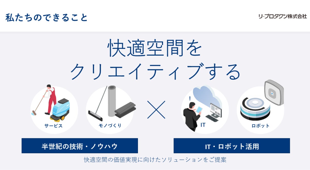 リ・プロダクツ株式会社は、「清掃を科学的に捉え、快適空間を創造することで社会に貢献し、働く仲間の幸福を追求すること」をミッションに掲げ、”清掃DXによるソリューション”を広げるべく事業を展開する企業です。