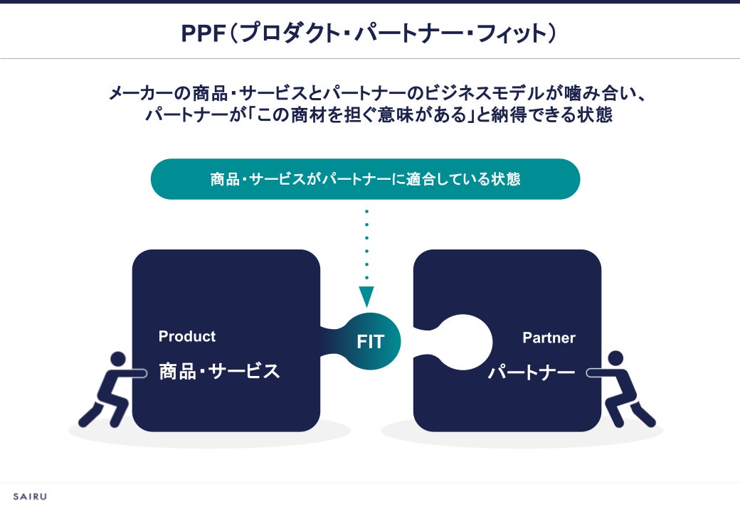 PPFは、商品・サービスがパートナー企業のビジネスモデルにカチッとはまり、「これを担ぐことで自分たちが儲かる、成長できる」とパートナーが確信できる状態を指します。スタートアップ業界で使われるPMF(プロダクト・マーケット・フィット)になぞらえた概念です。