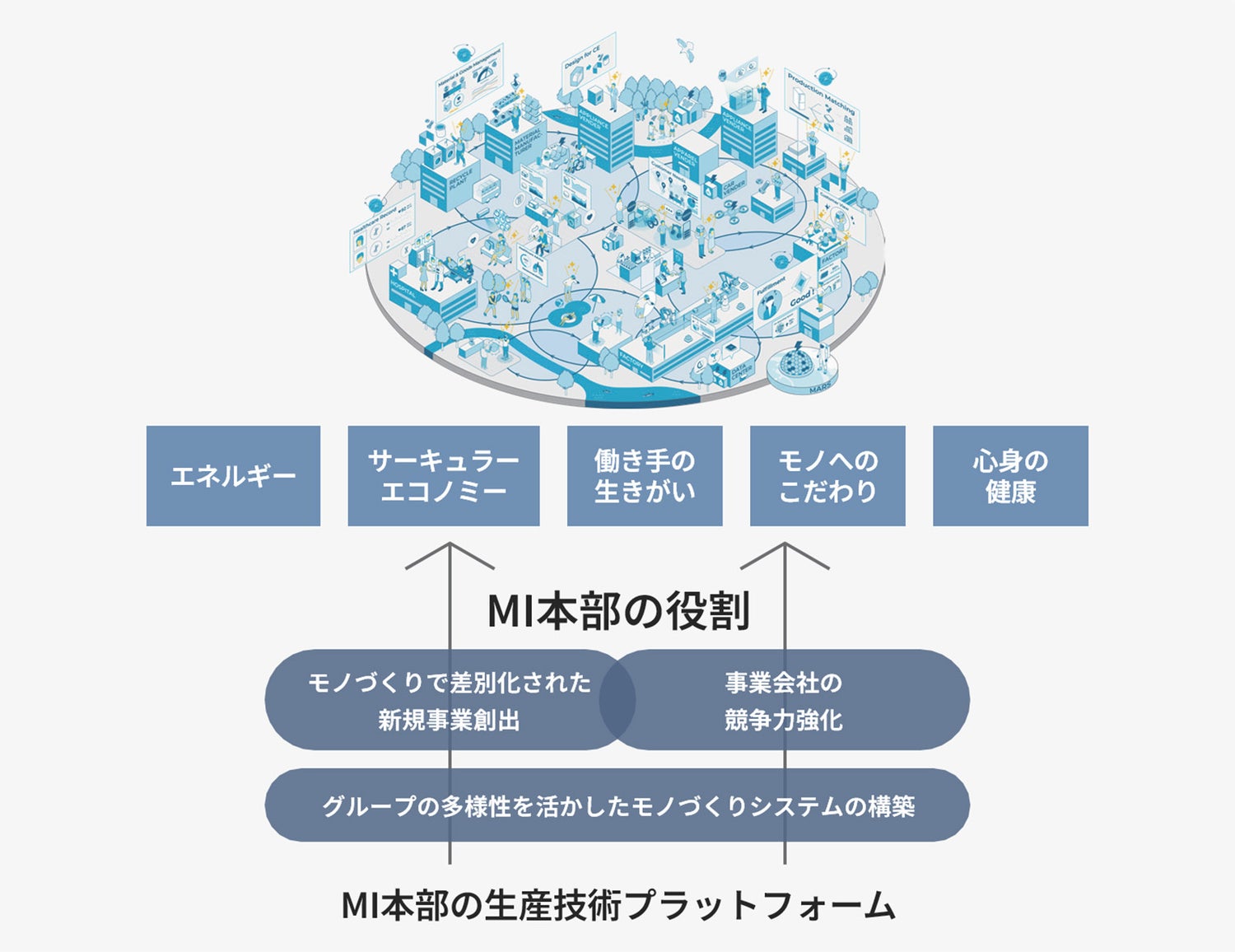 現在のMI本部は、生産技術に精通した技術者集団として、グループ内事業の競争力強化を支援するとともに、外部向けの新規商材となる生産設備ソリューションの開発に取り組み、社会に新たな価値を創出することを目指している。