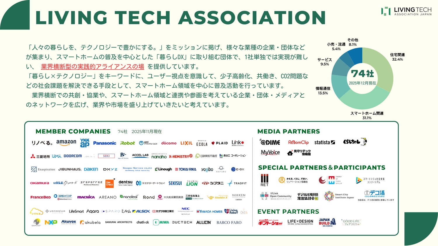 「人々の暮らしを、テクノロジーで豊かにする。」をミッションに掲げ、2020年に業界横断型、実践的アライアンスの推進により、スマートホームの普及をはじめとする「暮らし領域のDX」を目指すLIVING TECH協会(以下「LTA」)。
