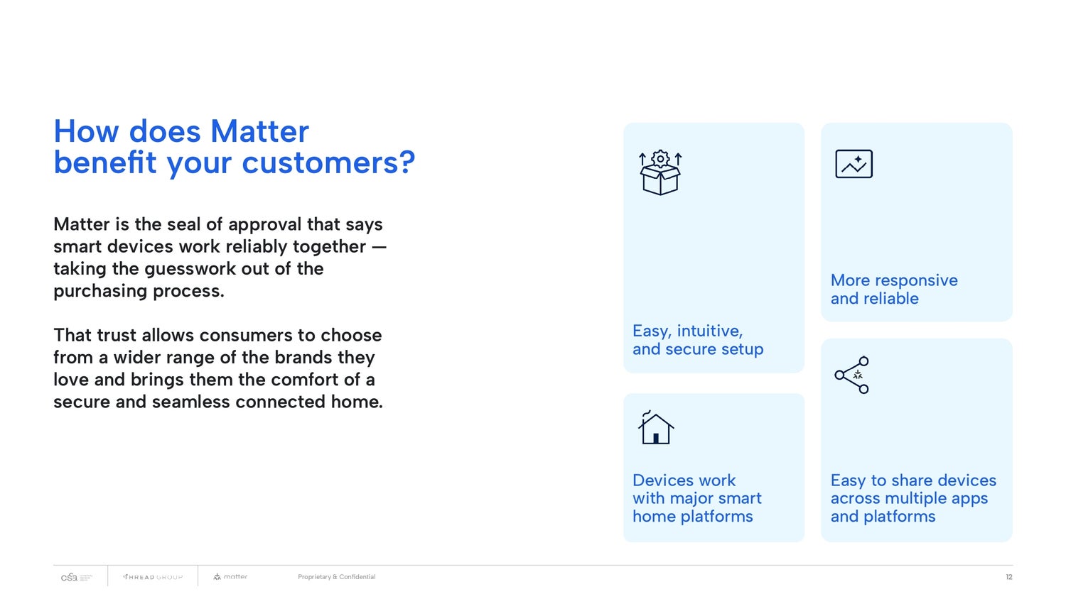 これ以外にもMatterのメリットはあって、私がよく説明するポイントは、セキュリティとスマートフォンのOSであるiOSやAndroidもMatterがサポートしていることで、これもユーザーメリットが大きい点ですね。AppleとGoogleがリードしているので必然で、スマートフォンとデバイスや家電が繋がる土台があると。今まで横断的に機能する規格がなかったので、Matterの一番大きな役割はここだと思っています。