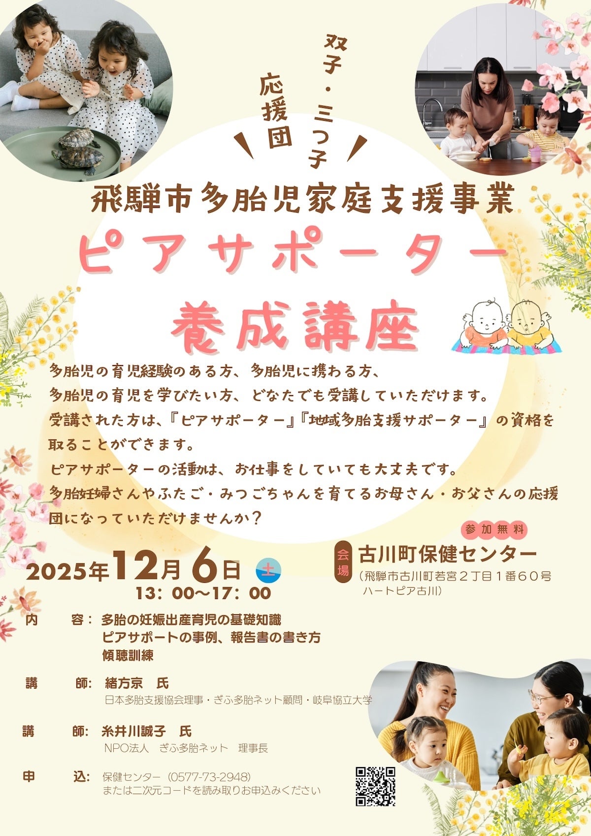 今年度からは、飛騨市産後ケア訪問型無料券交付、多胎児家庭への支援の制度化や、多胎家庭を支援するサポーターの養成講座も開催しました。