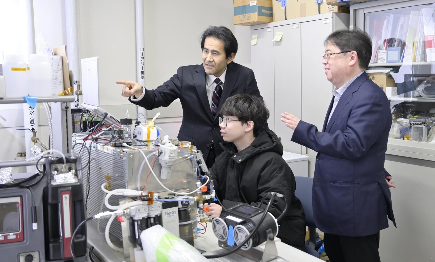 原田教授の研究室にある微細水粒子の測定装置。手前右の黒い装置がアイシンの提供した微細水粒子を発生させるナノ構造の特殊膜カートリッジ