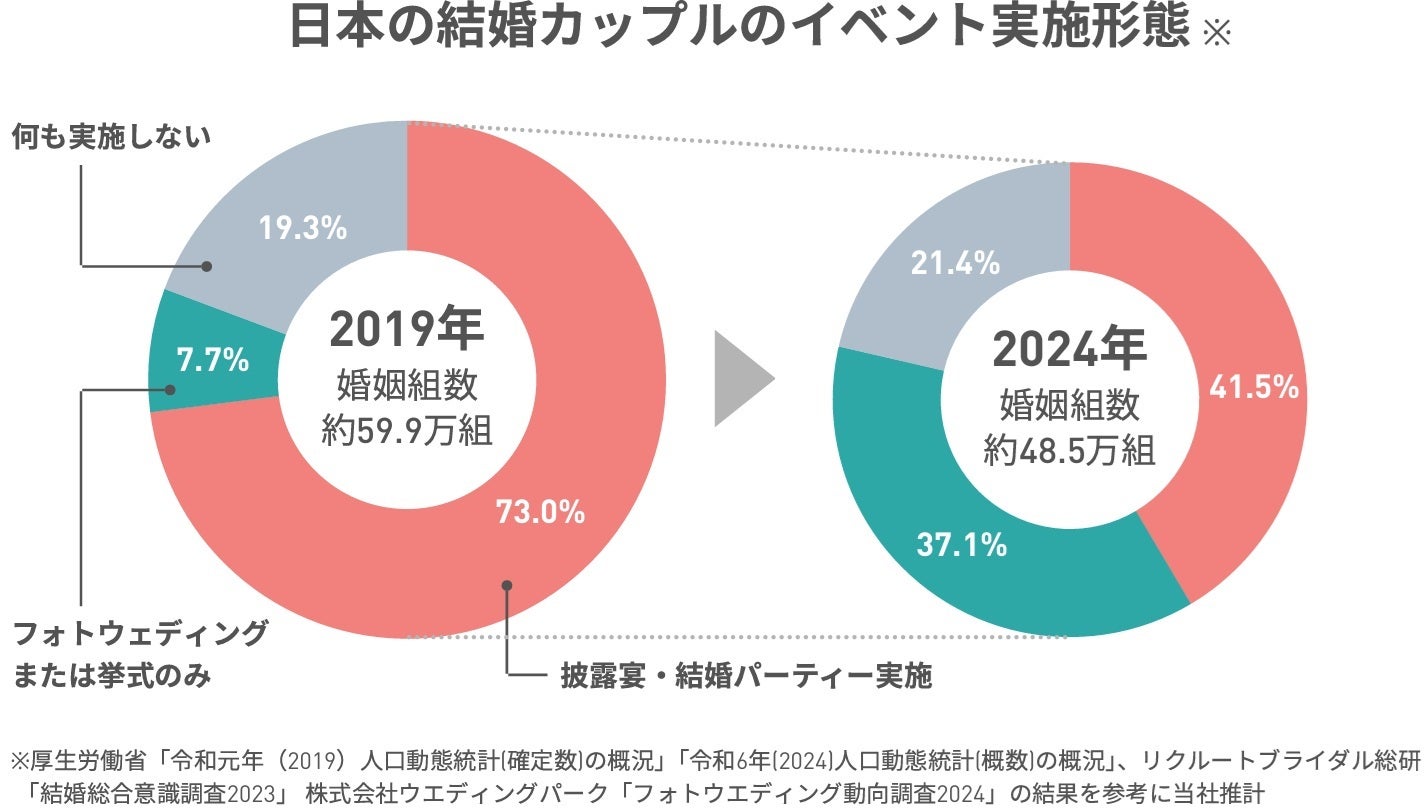 厚生労働省の「令和6年(2024)人口動態統計月報年計(概数)の概況」によると、婚姻件数は2019年の約60万組から、2021年以降はおおむね50万組前後で推移し、約2割減少しました。ブライダル業界にとってさらに大きな変化は、披露宴や結婚パーティーを行う人の割合です。披露宴や結婚パーティーを実施するカップルは全体の約4割にまで減少し、ブライダル業界の市場規模はコロナ禍前の半分ほどに縮小しました。