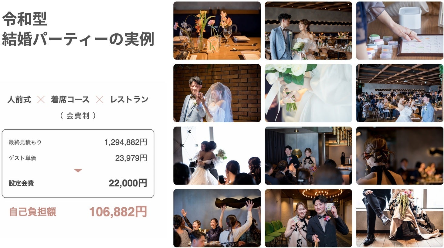 当社の最大の特徴は、自社で式場を持たず、ホテルやレストランの空き時間を活用して会場をリーズナブルに提供する仕組みにあります。この強みを活かし、40~50人規模の場合、総額100~200万円と、従来の結婚式の約半額で実施できます。