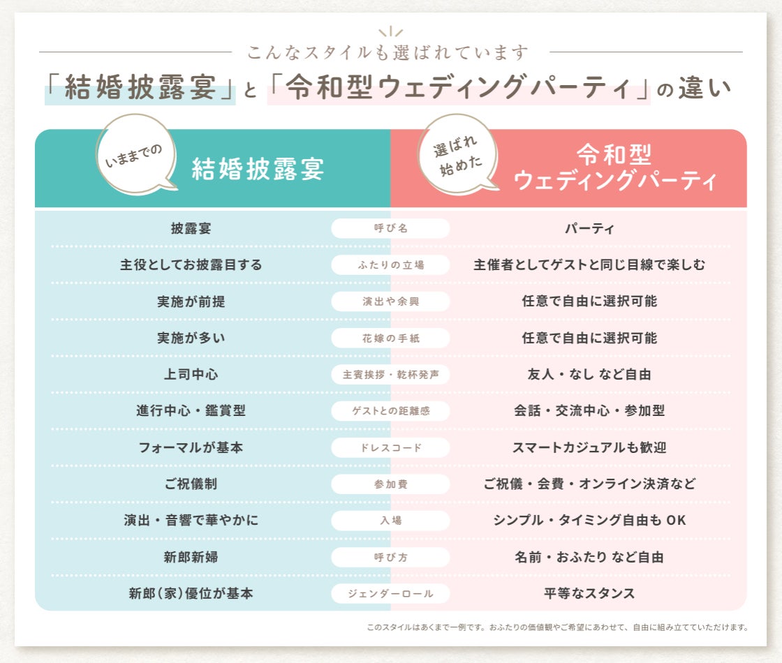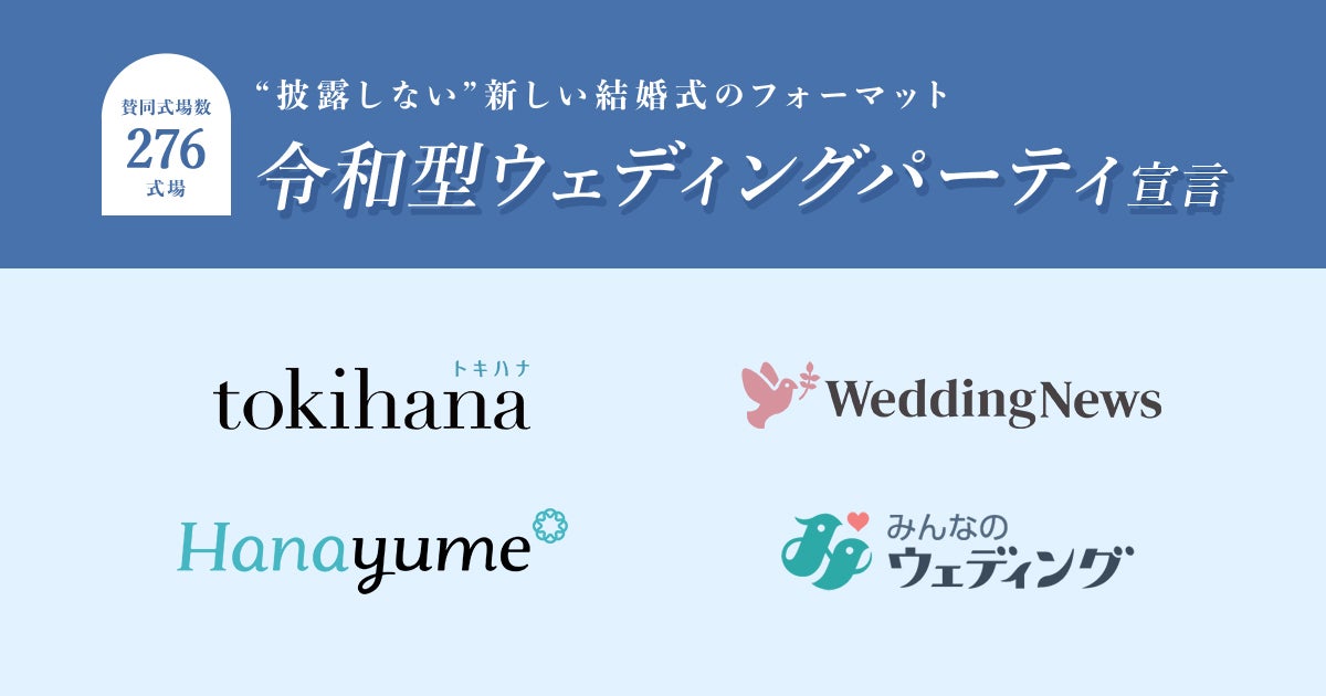 業界でも新たな動きが出ています。9月30日、公益社団法人 日本ブライダル文化振興協会に加盟する「みんなのウェディング」を含むブライダルメディア4媒体が、“披露をしない”をコンセプトにした新たな結婚式のスタイル「令和型ウェディングパーティ」推進を宣言しました。