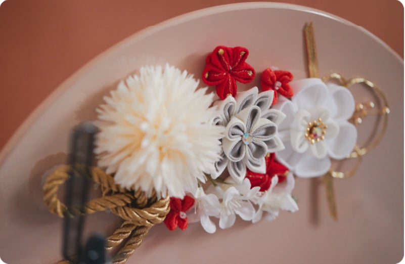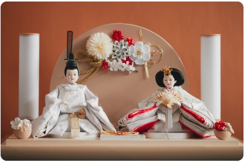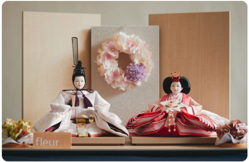 ヒントにしたのはトレンド。成人式の髪飾りやシンプルで落ち着きのあるインテリアも参考にした。さらには、「おひな様とおだいり様が真正面を向いているのが従来の配置でしたが、ほんの少し向かい合わせることで結婚式を迎える仲睦まじい2人を表現した」というものも。