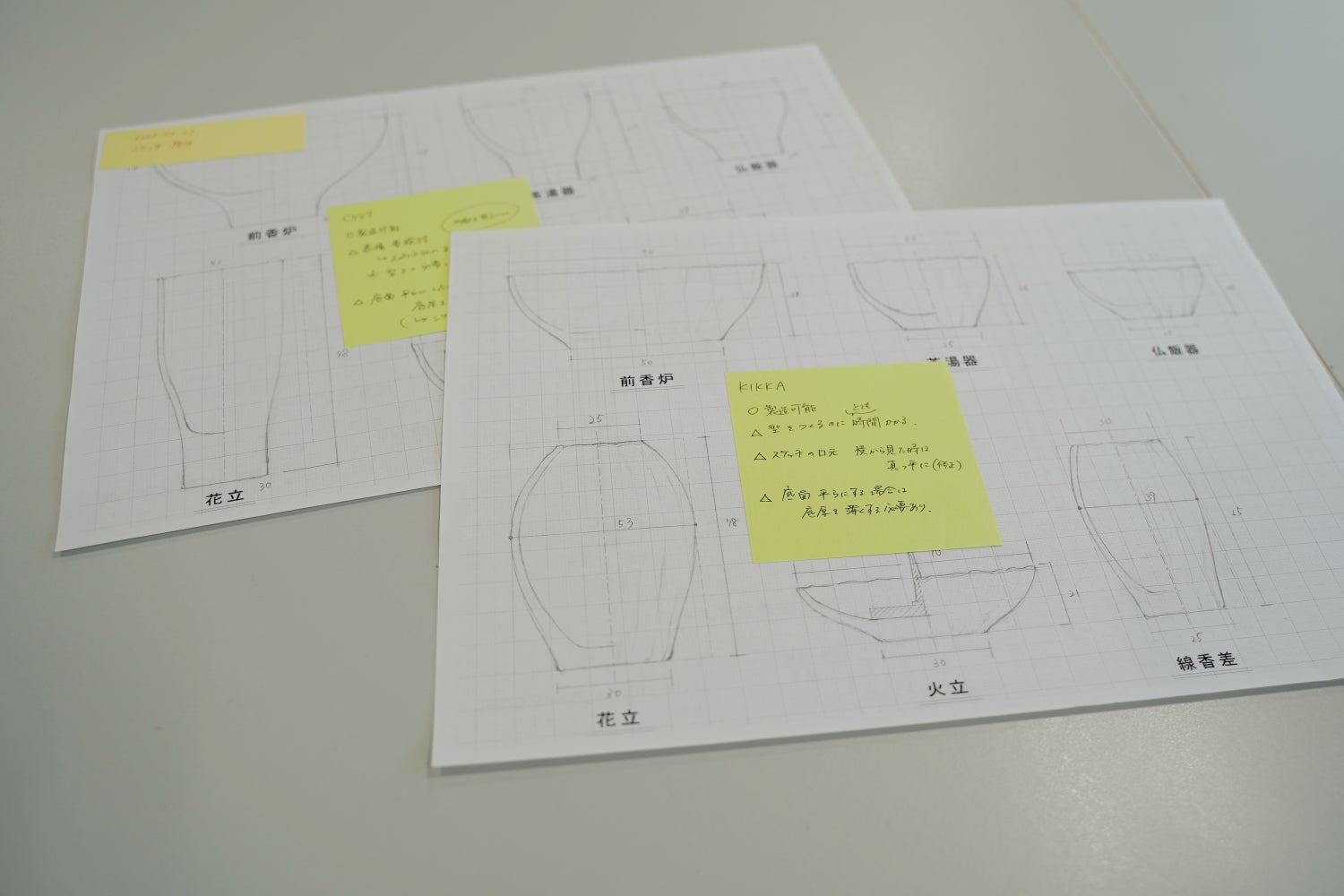 Sghrさんのカタログを参考に、職人さんが作りやすい形を自分でもスケッチをしながら「この製品をベースに」とお願いすることが多かったですね。形や模様も「この製品のデザインでお願いします」など。図面にも一言書き加えてましたね。6具足(前香炉、火立、花立、仏飯器、湯呑、線香差)セットの製品だったので、並んだときに統一感を出したくて全体のラインが整っていることを大切にしました。