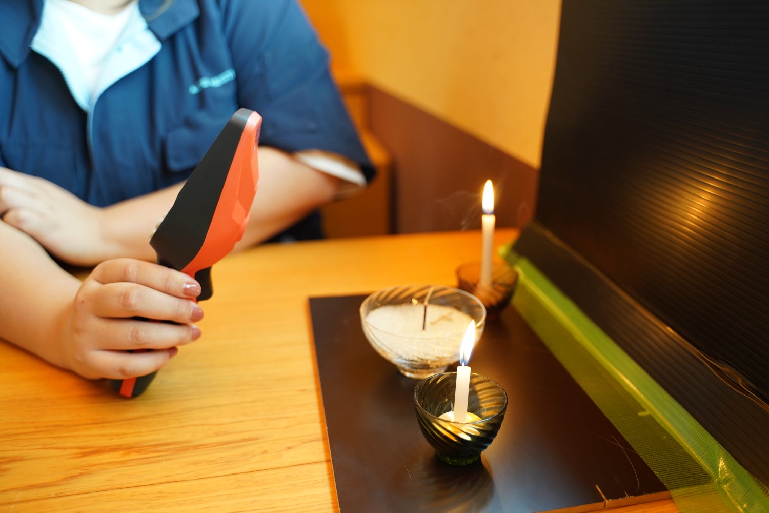 ガラス素材の実験は未経験の範囲。でも、やってみるしかない。とにかく、やってみようと、サーモ測定器を使って、ロウソクや線香の熱の伝わり方を数値で把握したり、器への影響を確認する試験などを2日間かけて行いました。