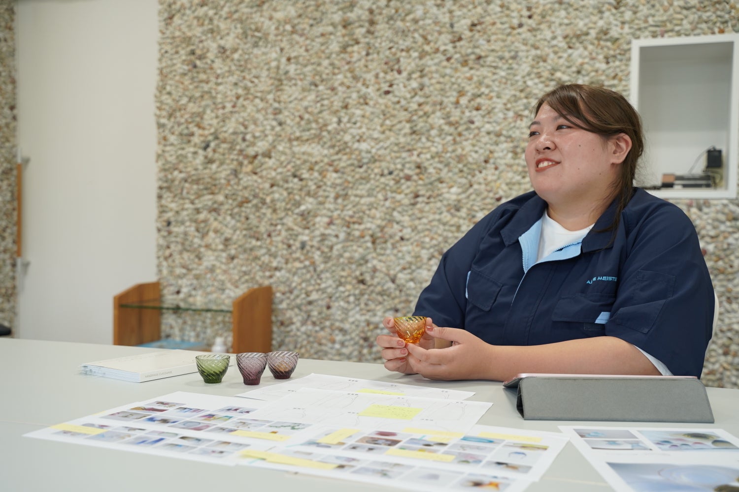 今回、新商品のガラス仏具「流彩」のデザイン・設計を手掛けたアルテマイスターの開発部に所属する石川由萌さん。開発にまつわるお話を伺いました。