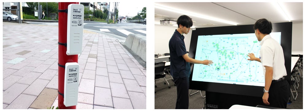 草加市内でのSUIJIN設置写真(左)とSUIJINアプリで浸水状況を確認している様子(右)