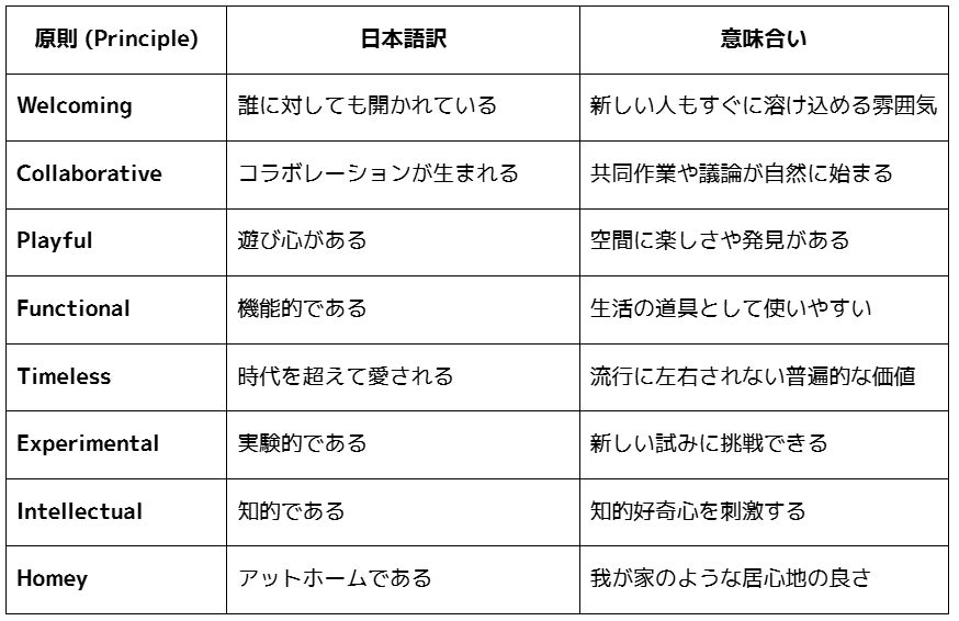 U Shareの空間づくりには、必ず守られるべき「8つの原則(Design Principles)」が存在します。これらは、単なるデザインのルールではなく、そこに住む人々の行動や心理にどう影響を与えるか、という視点から作られています。