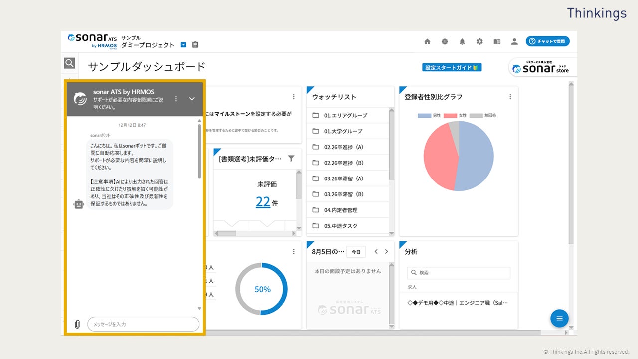 私たちThinkings株式会社は、採用管理システム「sonar ATS by HRMOS(以下、sonar ATS)」を提供するHR Tech企業です。「sonar ATS」の問い合わせ対応を担うsonar ATSヘルプデスク(以下、SHD)チームでは、問い合わせ対応に生成AIチャットボットを導入しました。