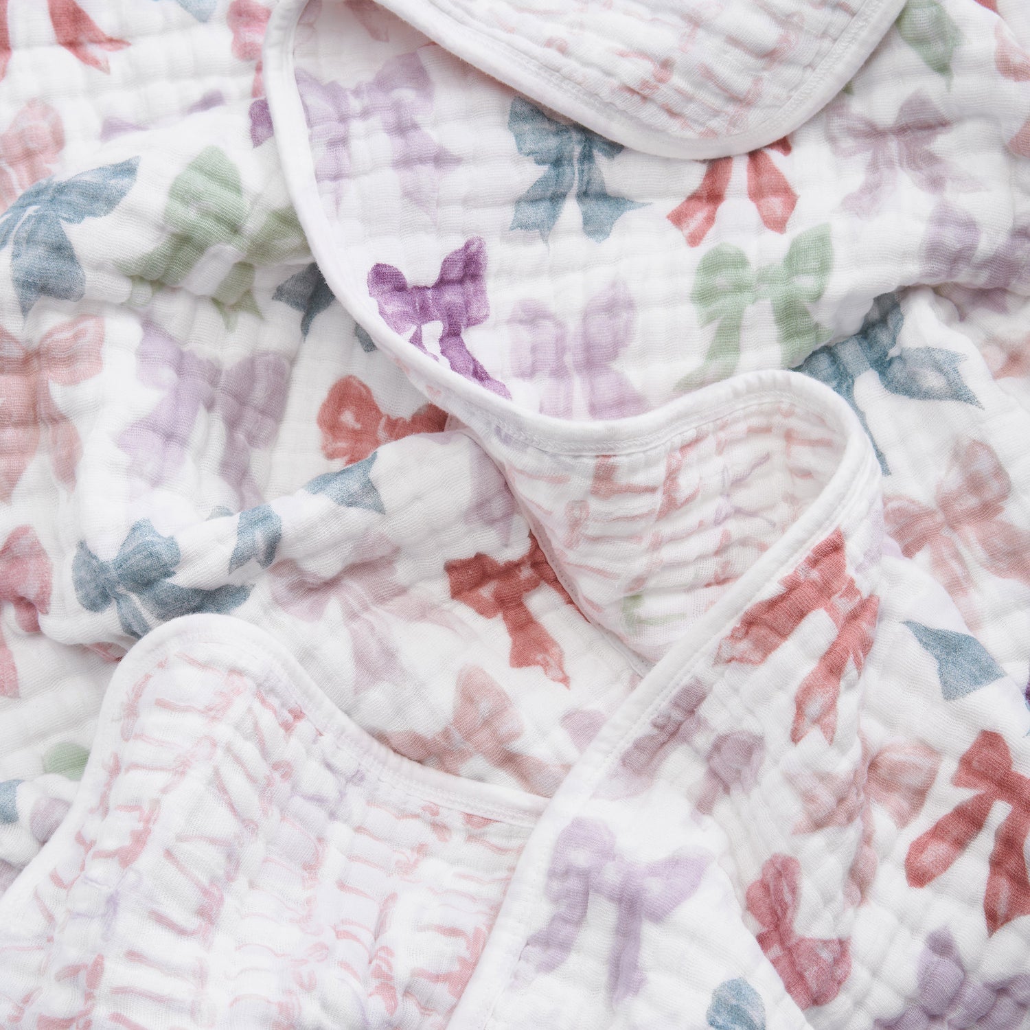 様々な色のリボンが散りばめられた、繊細でフェミニンなコレクション。モスリンの透け感が柄をよりやわらかく見せ、手に取るほどに愛おしさが増します。