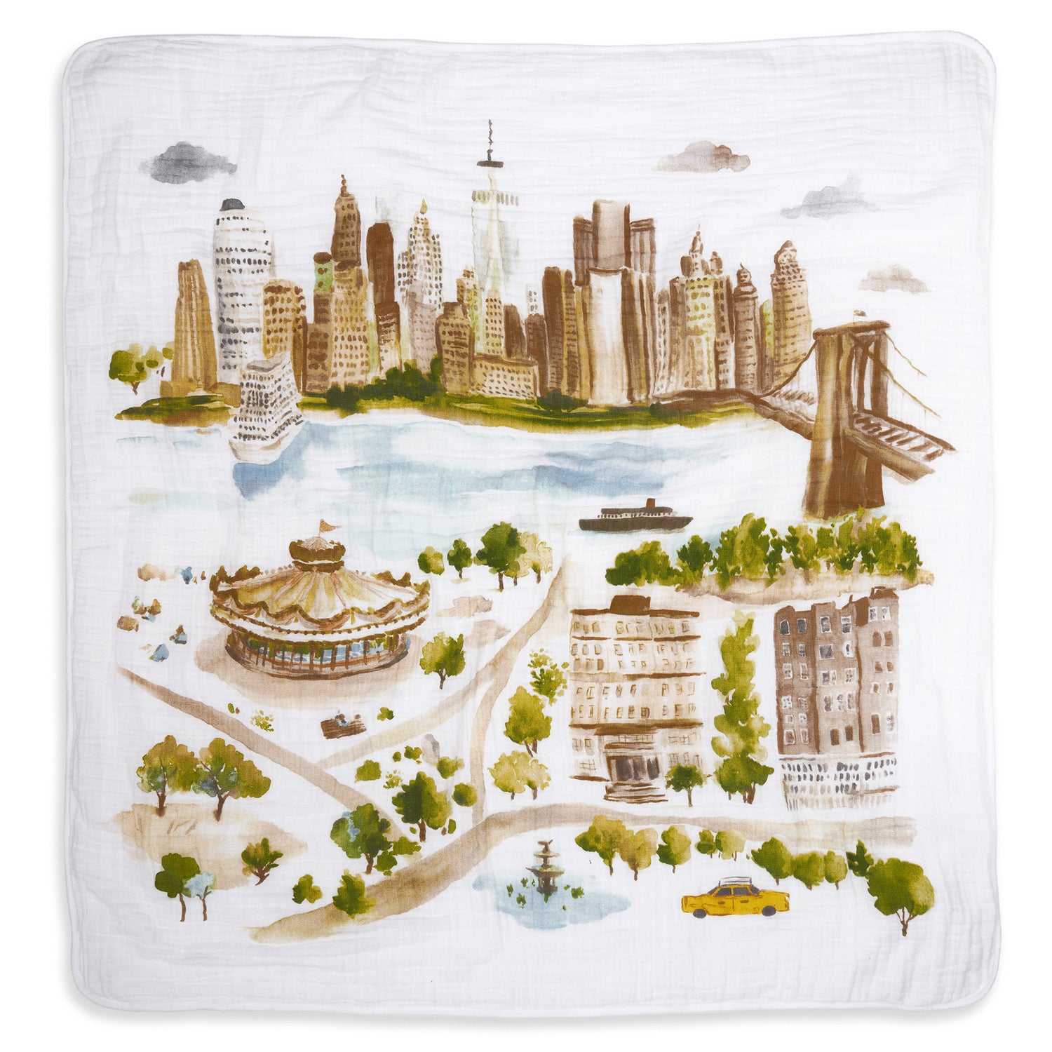 ニューヨークの街並みをやわらかなタッチで描いたミューラル(一枚絵)プリント。橋、ビル、木々、回転木馬——細部まで描き込まれた柄は、広げるたびに発見がある一枚です。