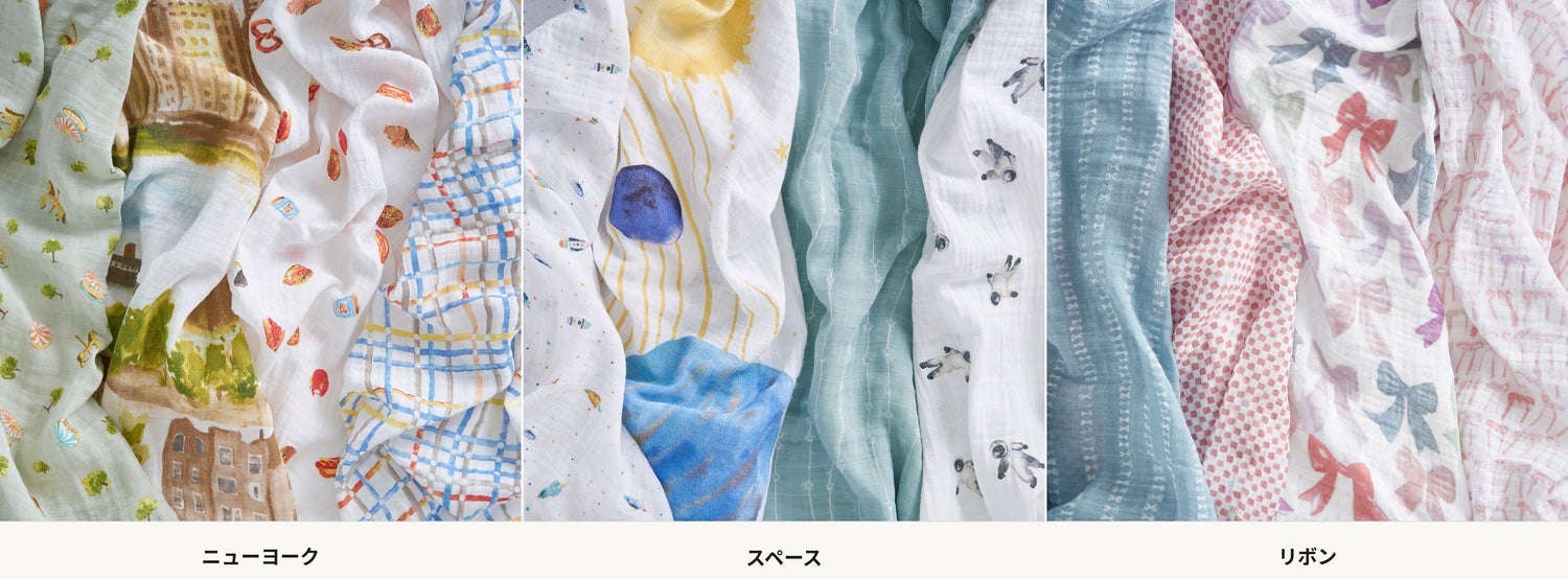 記念撮影に使いたくなる、プレゼントに選びたくなる——どの柄も、そういう瞬間を思い描いてデザインされています。赤ちゃんとの最初の日々に、ただそこにあるだけでなく、写真と共に記憶に残したくなる一枚を。