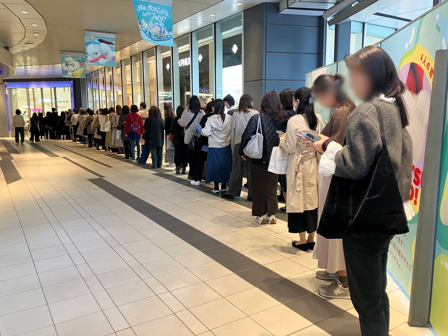 <グッズ販売初日の約150人の行列、限定グッズを求めるお客さまでにぎわう施設内>