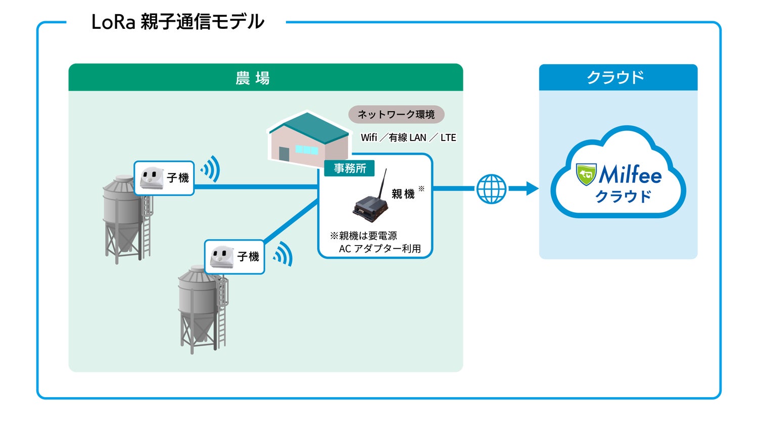 こうした状況に対して、当社では「Milfee(ミルフィー)LoRa親子通信モデル」を提案しています。このモデルでは、事務所に設置した親機から、LoRaという低消費電力・長距離通信が可能な無線技術を使って、飼料タンクに設置された子機と通信を行います。これにより、携帯電話回線が届かない場所でも、飼料残量の“見える化”を実現することができます。