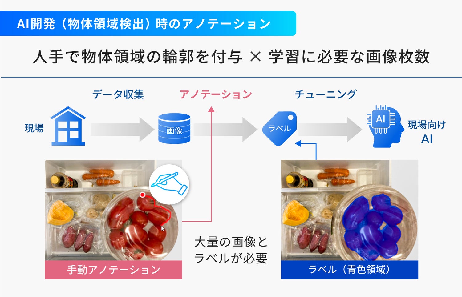 冷蔵庫を例にすると、AIに「トマト」を覚えさせるには、人間が何万枚もの画像に手作業で正解のラベルを貼る「アノテーション」が必要となります。