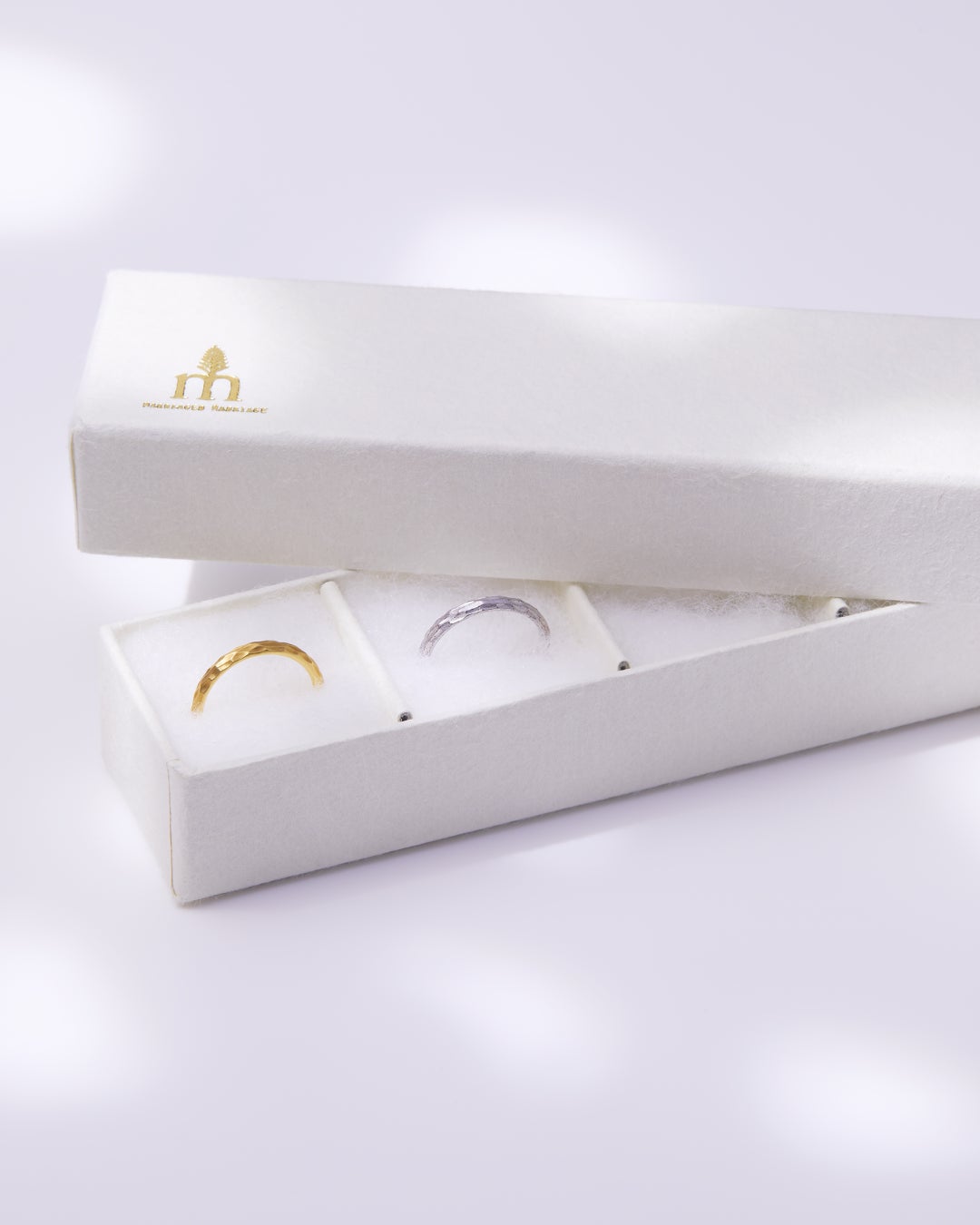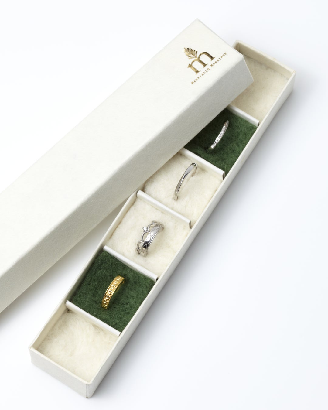 「結婚指輪を購入したいけれど、二人とも忙しくて店舗に行く時間がない」「慣れない宝飾店は敷居が高い」──そんな声に応えるのが、渡部が開発したサンプルリングの試着サービスです。申し込みから数日で、ご自宅に自分にぴったりのサイズのサンプルリングが郵便ポストに届き、自宅という実際に結婚指輪を着けるリラックスした環境で、朝昼晩何度でも試着出来るのは楽しい体験でもあります。自然光の下や普段の服装に合わせて、本当に似合うかどうか確認できるのは、自宅で試着することの大きなメリットです。