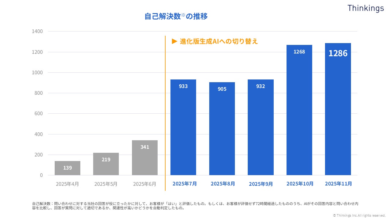 坂本:お客様の自己解決数は4倍ほど向上しました。当時は最大で月間300件程度だった自己解決数※2が、まず900件ほどに増え、現在では1300件程度まで増加しています(2025年11月時点)。