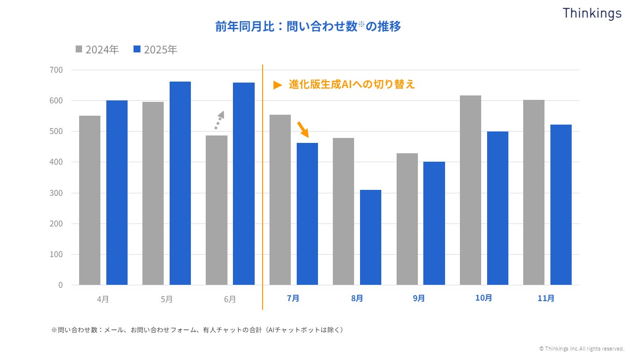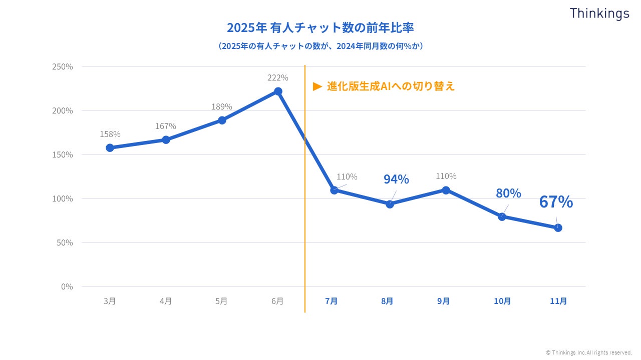 有人チャットへのお問い合わせ数も減少しており、2025年11月には前年比で33%減(前年度比67%)という実績があります。
