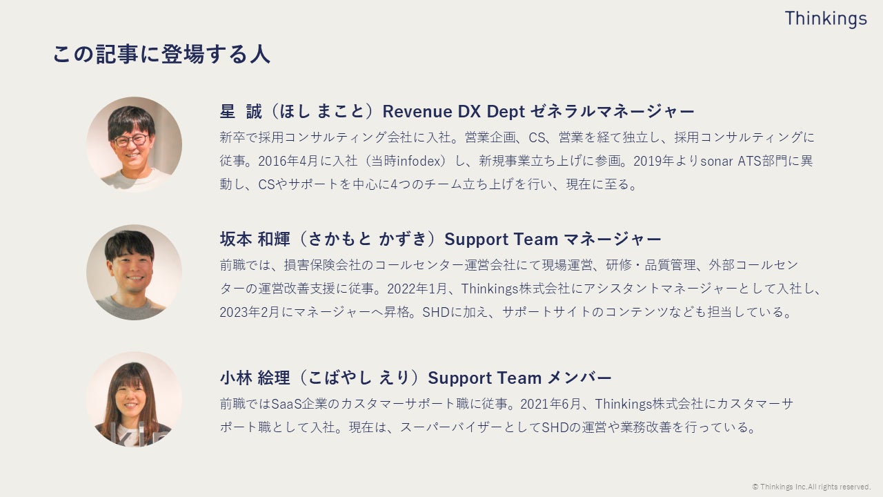 私たちThinkings株式会社は、採用管理システム「sonar ATS by HRMOS(以下、sonar ATS)」を提供するHR Tech企業です。前編に続き、お客様からの問い合わせ対応を担うsonar ATSヘルプデスク(以下、SHD)チームに、「生成AIチャットボット導入の裏側と成果」を聞きました。