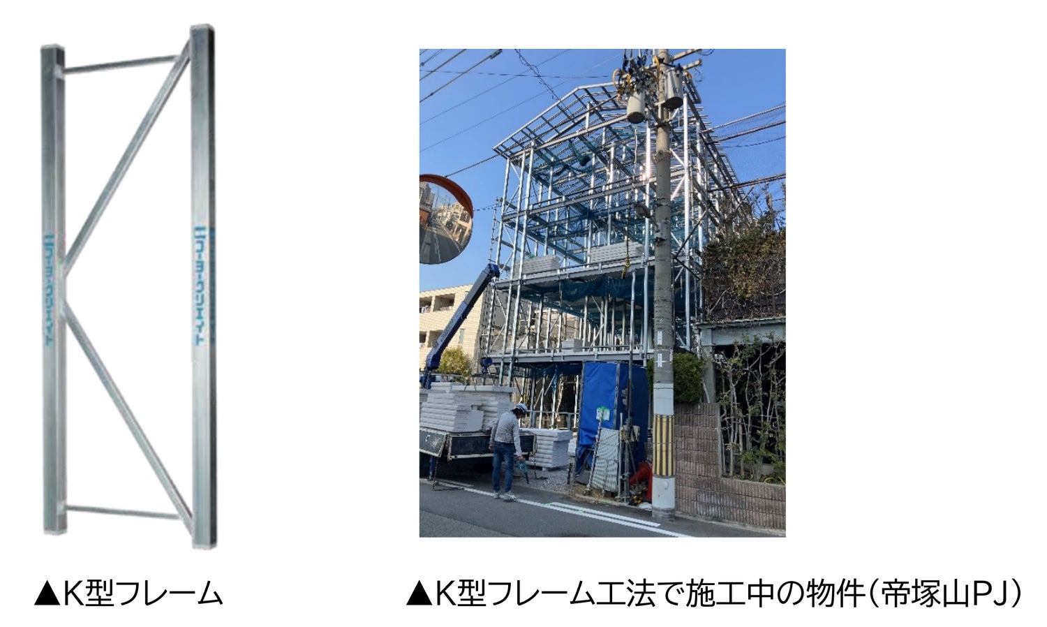 建築面において、関西特有の「K型フレーム工法」を採用した点も大きな特徴です。これはアルファベットの「K」の形をした構造体を用いる、耐震・耐久性に優れた鉄骨造の建築工法です。RC(鉄筋コンクリート)造と比較して建築費を抑えられるだけでなく、柱型や梁型が出ないため、設計の自由度も高く、工場で製造されたK型フレームを現場搬入し、大型クレーンが入らない狭小地でも効率的に組み上げられるというメリットがあります。
